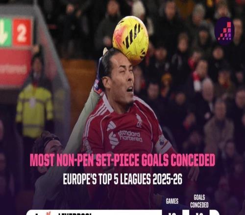 数据网站OPTA统计,在2025-26赛季欧洲五大联赛中,利物浦、伯恩茅斯与诺丁汉森林三支球队并列成为非点球定位球...