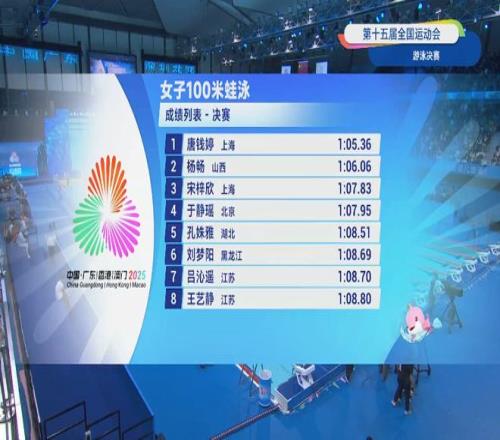 北京时间11月12日,第十五届全运会游泳项目迎来女子100米蛙泳决赛的较量。最终,该项目世锦赛冠军、巴黎奥运会亚军得主,上海队运动员唐钱婷以1分05秒36的成绩第一个触壁,为上海队再添一枚金牌!同时,获得生涯首枚全运会个人项目金牌。另一位上海选手宋梓欣以1分07秒83获得第三名,拿到铜牌!