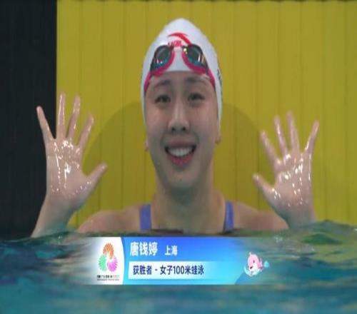 11月12日,全运会游泳女子100米蛙泳决赛,上海队的唐钱婷1分05秒36夺得金牌,山西队的杨畅1分06秒06获得银牌,上海队的宋梓欣获得铜牌。